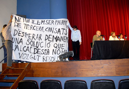 Els veïns del carrer de Pere Joan que reclamen que els solucionin els problemes d’inundacions que pateixen, van desplegar ahir una pancarta durant el debat electoral que es va fer a La Gorga. Els afectats reclamaven a l’alcaldessa, Teresa Ferrés, una actuació per resoldre el conflicte que els enfronta a una comunitat de propietaris veïna, a qui acusen dels problemes que pateixen amb l’aigua.Com ja hem explicat, una comunitat del carrer de Santiago Bañeras va construir un mur que, segons els veïns del carrer de Pere Joan, ha tapat la sortida d'aigües plujanes. Això fa que quan plou molt, se'ls neguin les cases. Els afectats han reclamat reiteradament a l'Ajuntament una solució a aquest problema. Els veïns diuen que no els fan cas. Per aquest motiu, ahir van anar al debat per reclamar més atenció per part de l'alcaldessa, Teresa Ferrés. Ho ha explicat una de les portaveus veïnals, Teresa Robledillo.