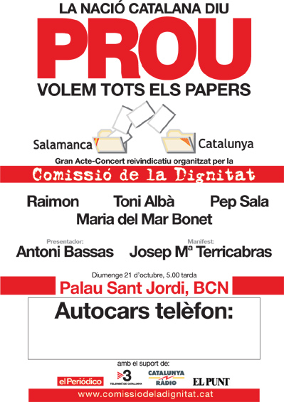 La Comissió de la Dignitat organitza diumenge vinent a Barcelona un gran acte reivindicatiu per reclamar el retorn dels documents catalans dipositats a l’Arxiu Històric de la Guerra Civil, a Salamanca. Des de Palamós s’està organitzant un autocar per a tothom que desitgi anar-hi. El preu del tiquet, que inclou el viatge i l’entrada al Palau Sant Jordi, és de nou euros. Per fer les reserves cal trucar al telèfon 650390834. Aquest acte-concert reivindicatiu es farà el diumenge, a les cinc de la tarda. Comptarà amb les actuacions dels cantants Raimon, Maria del Mar Bonet i Pep Sala, així com la de l'actor Toni Albà. Estarà presentat pel periodista Antoni Bassas i el filòsof gironí Josep Maria Terricabras serà l'encarregat de llegir-ne el manifest.